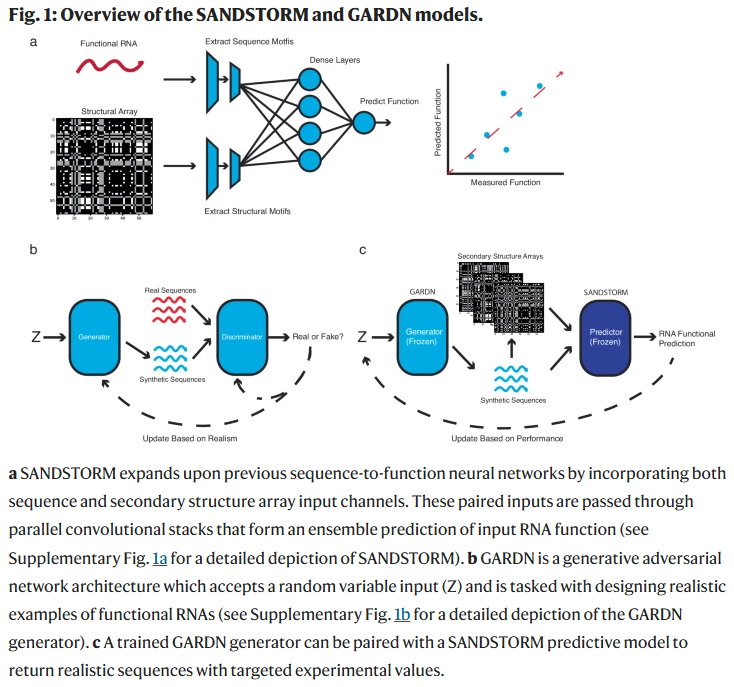 尽管RNA分子的功能受序列与结构共同影响,但目前尚无一种通用的深度学习框架能够同时整合这两类信息以提供功能预测。为此,研究人员提出了一种新的深度学习方法SANDSTORM,该方法融合RNA分子的序列与结构信息,用于预测多类RNA的功能活性。借助SANDSTORM神经网络,研究人员能够准确预测5′ UTR、RBS、CRISPR引导RNA以及Toehold开关核糖调控元件的功能表现。进一步地,研究人员将该预测模型与生成对抗RNA设计网络(GARDN)结合,成功生成了多类具有理想功能性质的新型RNA分子。该联合设计方法表明,SANDSTORM架构所学习到的二级结构抽象信息可被生成模型有效利用,从而生成符合实验热力学特征的新结构。具备在多种应用领域中对RNA序列进行精准预测与定向生成的能力,有望成为新一代计算RNA工具的重要基础。