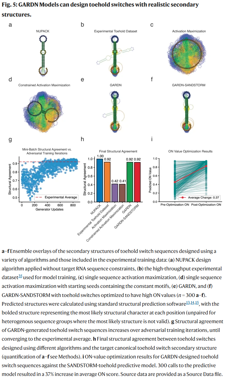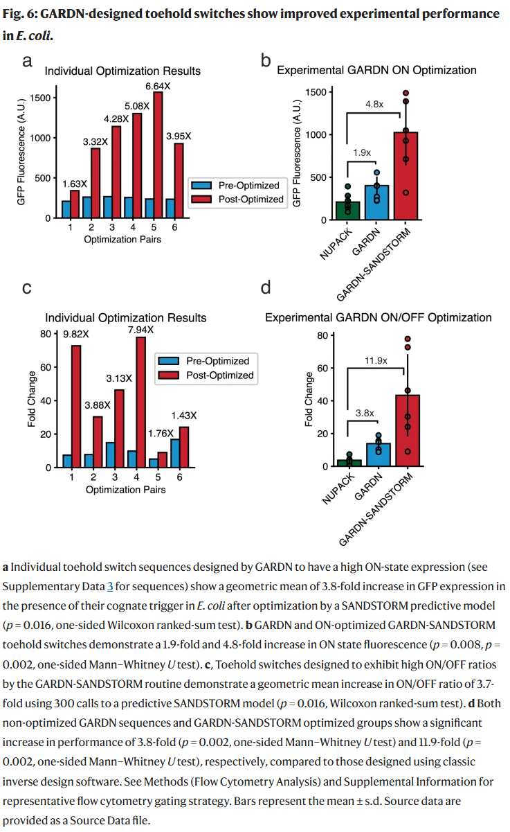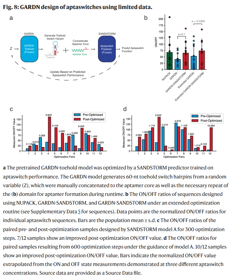 此外,与NUPACK相比,未优化的GARDN输出和GARDN-SANDSTORM优化序列分别实现了3.8倍和11.9倍的ON/OFF比值提升,并且这一性能提升并未牺牲序列或结构的真实性。