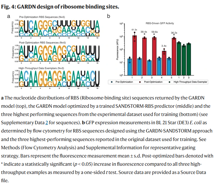 进一步地,研究人员将优化步数由300增至600,结果显示平均比值升至74.02,显著高于初始组的52.57(p = 0.039),其中10/12序列显示优化效果。优化后序列的最高比值为161.9×与158.3×,远高于训练集中仅3.6%的高活性序列。这一结果表明,即使数据有限,GARDN-SANDSTORM也能生成高性能的RNA设计,具备出色的扩展能力。
