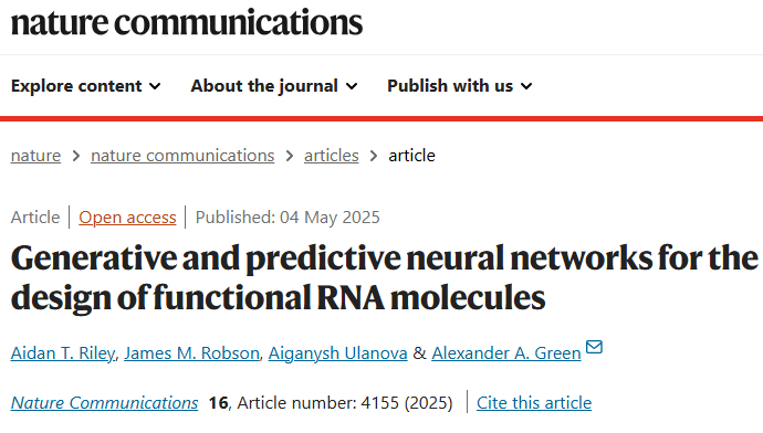Riley, A.T., Robson, J.M., Ulanova, A. et al. Generative and predictive neural networks for the design of functional RNA molecules. Nat Commun 16, 4155 (2025).