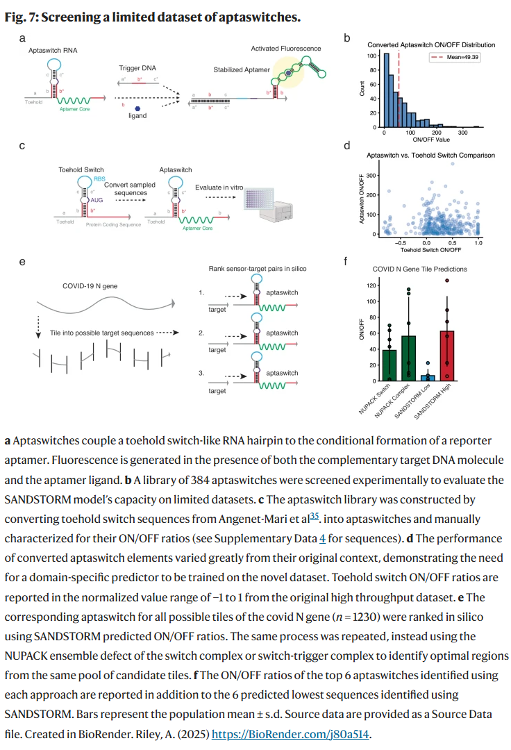 为模拟实际诊断应用情景,研究人员以SARS-CoV-2 N基因的1230个30nt片段为靶标,设计了一个aptaswitch候选库,并使用训练好的SANDSTORM模型预测ON/OFF比值进行排名。结果显示,SANDSTORM排名前六的序列平均ON/OFF比值为62.46,约为排名最低六个序列的10倍,并且优于NUPACK Switch(38.59)和NUPACK Complex(56.25)两种热力学方法。这说明,即使数据极度稀缺,SANDSTORM也具备良好的序列筛选能力,且其运行速度远优于NUPACK(1秒 vs 34.7秒),更适用于快速响应如疫情暴发等紧急场景。
