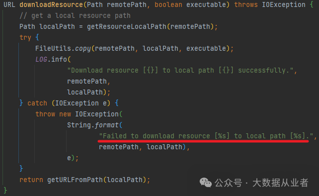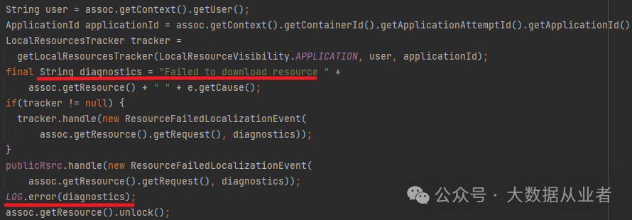 需要仔细辨别才能发现,虽然Failed to download resource能对应上,但是后面的异常对应不上。笔者刚开始没注意,浪费时间梳理Flink这块的代码。其实,真正的异常日志是AM container打印的,对应于Hadoop源码hadoop-yarn-server-nodemanager模块的ResourceLocalizationService资源本地化服务。对应源码如图所示: