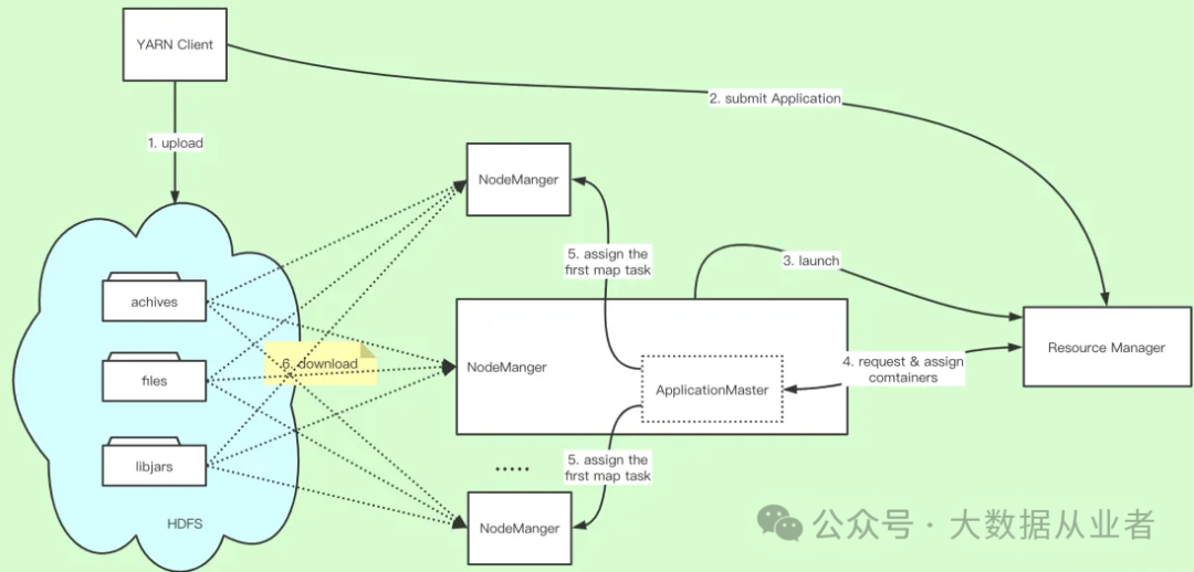 每个Application能够提交运行到yarn集群的流程都要包括:yarn client将资源文件上传到HDFS共享目录、ResourceManager启动ApplicationMaster进程、ApplicationMaster分配任务、nodemanager进程下载资源文件、然后启动container运行任务。大致流程如图所示: