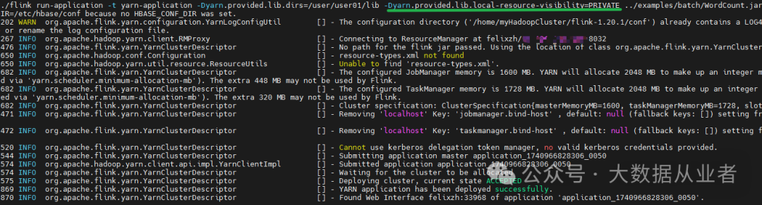 ./flink run-application -t yarn-application -Dyarn.provided.lib.dirs=/user/user01/lib -Dyarn.provided.lib.local-resource-visibility=PRIVATE ../examples/batch/WordCount.jar
