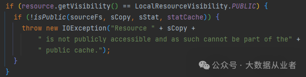 而后半段日志is not publicly accessible…对应于hadoop-yarn-common模块FSDownload类,对应代码如图所示: