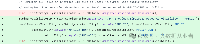 经过上述分析,解决方法分为两类:第一类适用于HDFS没有权限管理的环境,可以直接将资源文件放置到HDFS共享目录(即权限至少设置为755)。另一类适用于HDFS需要开启权限管理的环境,这种需要修改Flink源码将默认写死的可见性为PUBLIC改为可配置的PUBLIC/PRIVATE/APPLICATION。相关源码路径为: