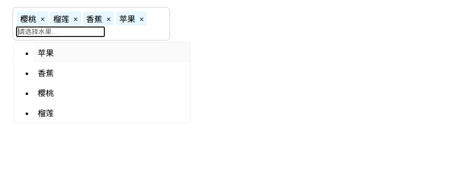 visibleOptions:当前展示的候选项,是 options 经过关键词过滤后的结果;selectedValues:用户已经选中的选项数组;highlightIndex:当前键盘高亮项的索引,用来控制上下移动。除此之外,还有个 inputValue 控制输入框绑定的值。