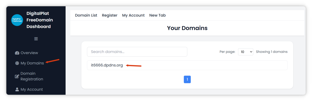 本文以 DigitalPlat 提供的域名为例,登录之后进入到 Dashboard。DigitalPlat FreeDomain Dashboard,进入 My Domains,选择要设置的域名,点击进入后找到 DNS 设置。