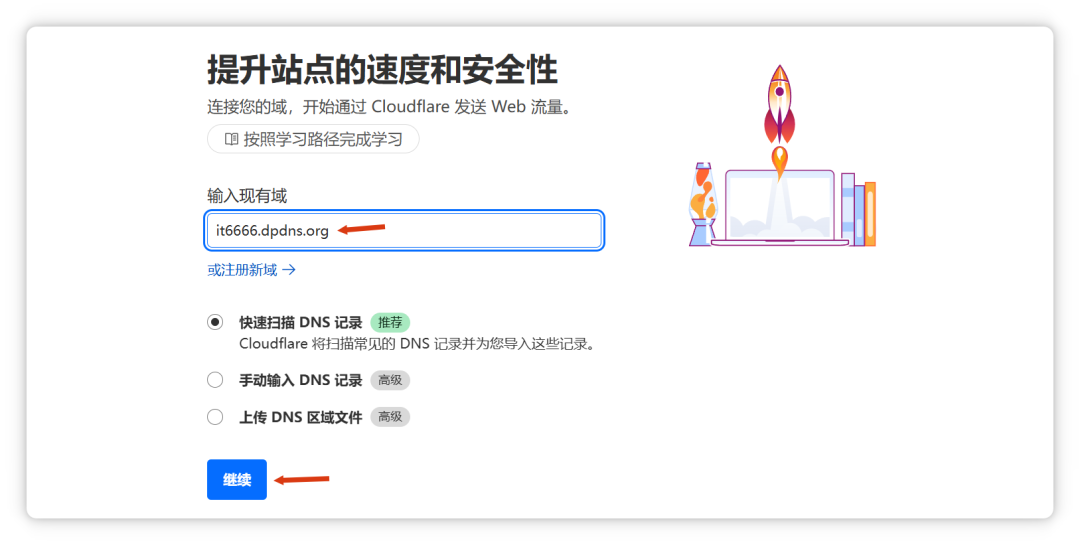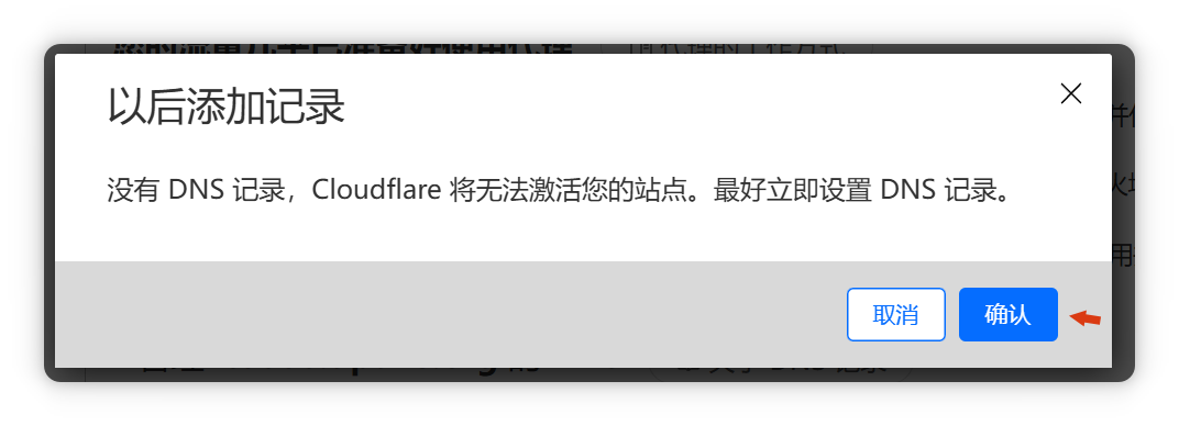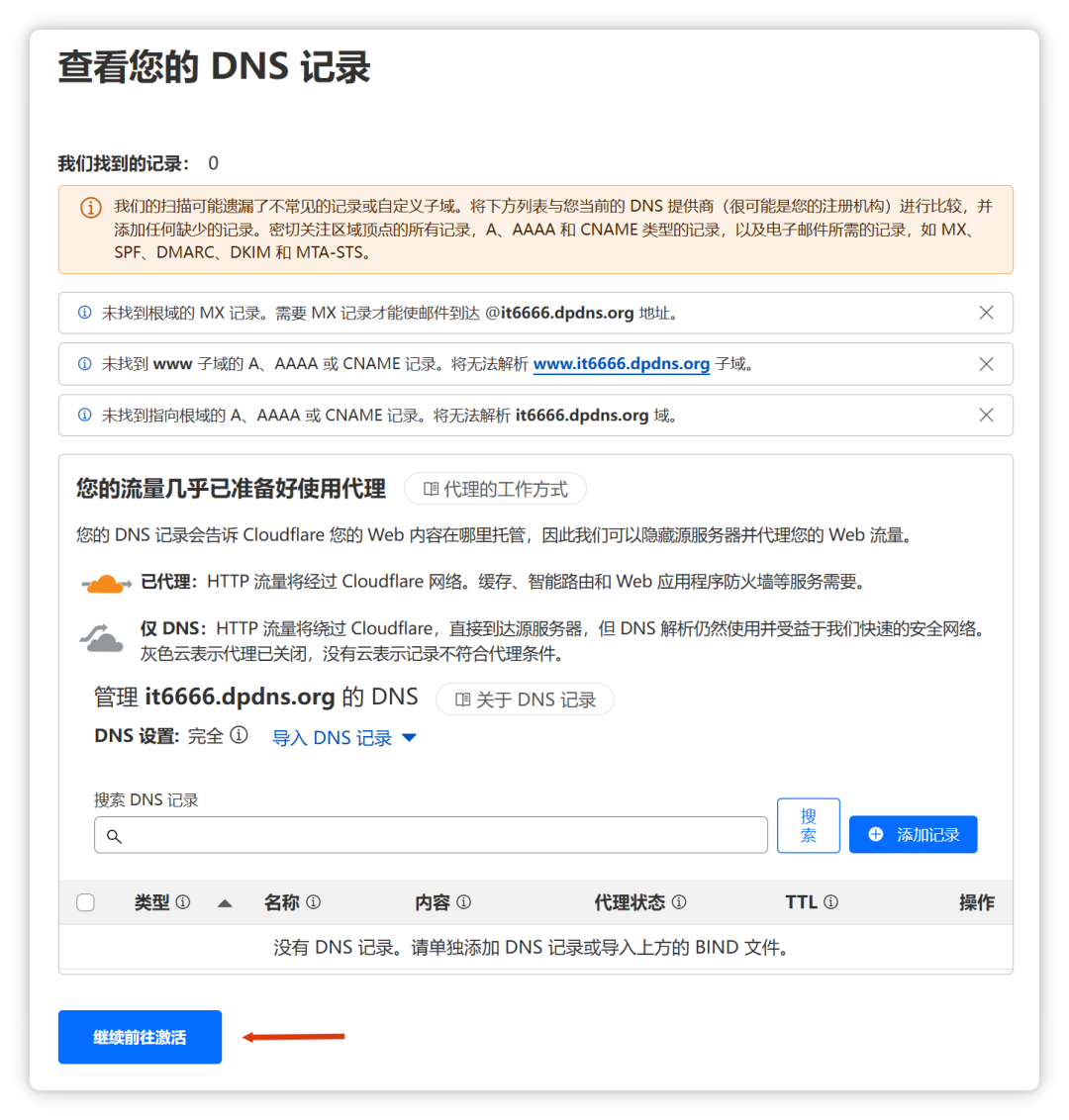 此时会提示:没有 DNS 记录,Cloudflare 将无法激活您的站点。建议立即设置 DNS 记录。