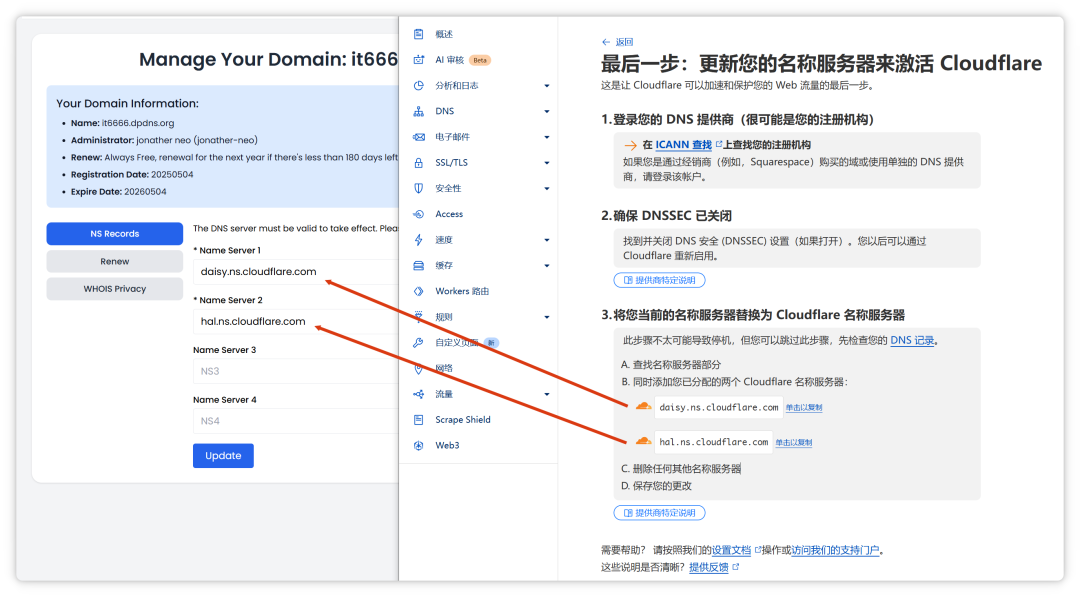 然后前往你的域名注册商后台,找到 DNS 设置,将这两个 NS 服务器地址替换原有的 NS 服务器。