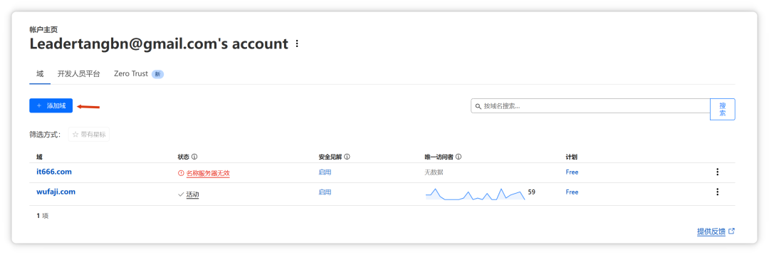 如果没有账号,请先注册,然后点击“添加域”。