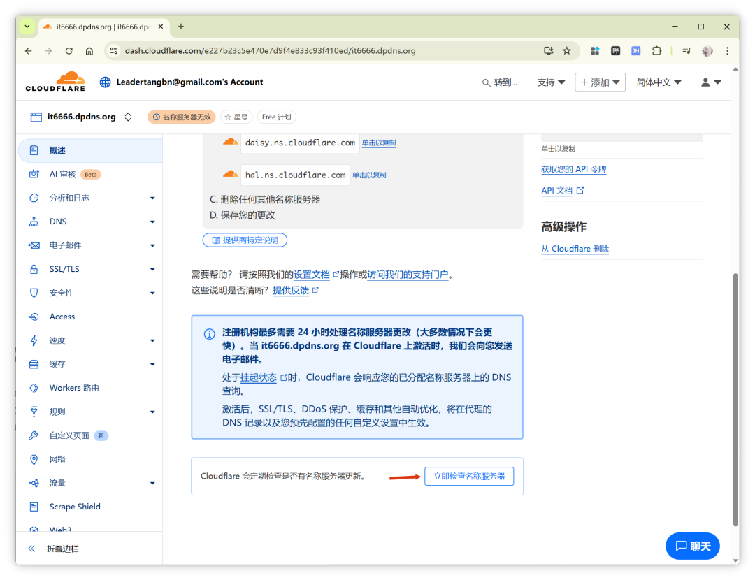 点击“Update”保存,然后回到 Cloudflare,点击“立即检查名称服务器”按钮。