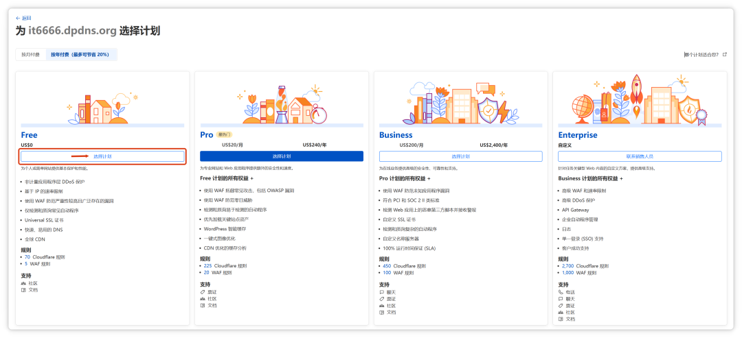 点击“继续”后,进入套餐选择页面,选择免费套餐即可。