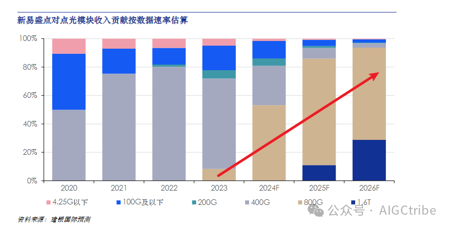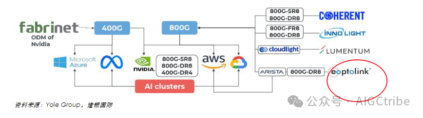 目前,800G光模块主要供应商为Coherent、中际旭创、lumentum、新易盛、海信。据估算,目前新易盛在 800G 光模块出货量市场占有 10-20%的份额,并且这一份额还在不断提升。