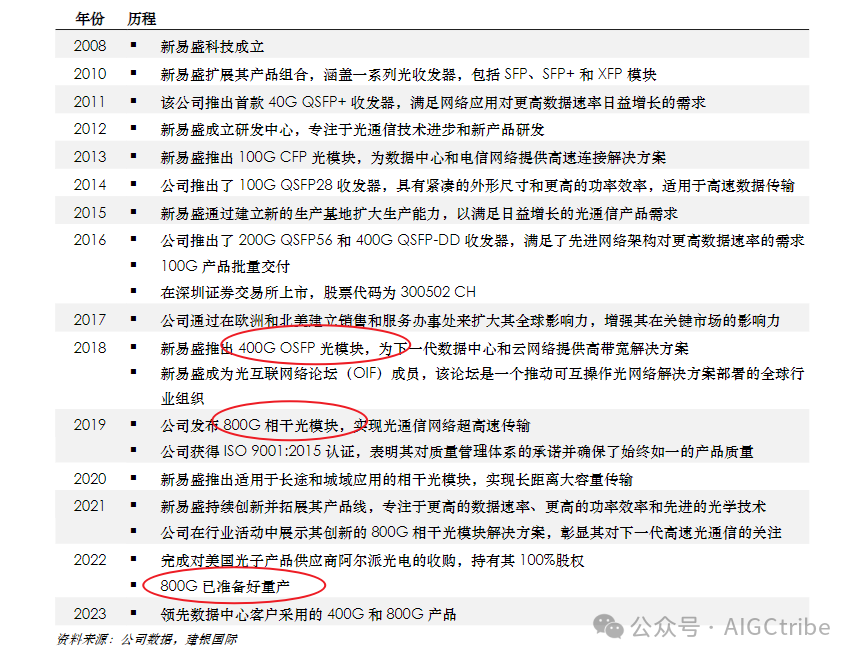 数通光模块产品迭代周期短,一般为 3-5 年,厂商需要保证研发能力跟随需求完成新产品迭代,新产品推出后价栺会进入下降通道直至稳定,厂商在新产品价栺下降时需完成成本控制、良率提升、制程改善和实现批量供应,以保证毛利率稳定,并随着产品规模效应显现,实现销售和管理费用率的下降,提升净利润率。新易盛与亚马逊 AWS、Meta、微软、英伟达这些最终AI数据中心客户深度合作,联合研发确定产品方案,这种模式保证了公司在AI数据中心光模块需求快速迭代时,能始终领先市场推出最新产品。由于公司与北美大客户紧密合作,加之独立的封装工艺和技术积累,在新产品推出上常常领先市场,产品迭代速度快。而这些新产品都可以享有较高的毛利率。