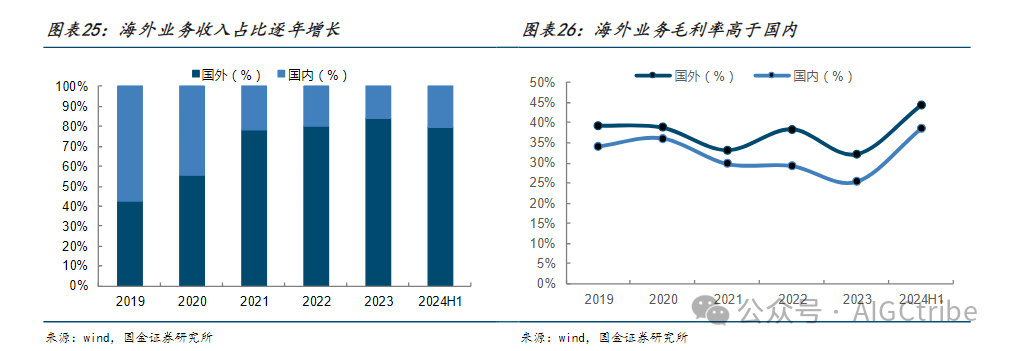 由于国内非常卷,同一产品国内销售的毛利率通常低于海外。新易盛的客户包括全球主流的通信设备制造商及互联网厂商(亚马逊 AWS、Meta、微软、英伟达、中兴通讯等),当前主要业绩贡献来自海外,且占比成逐年上升趋势,已经到79.56%。