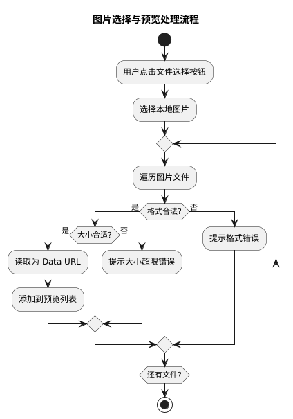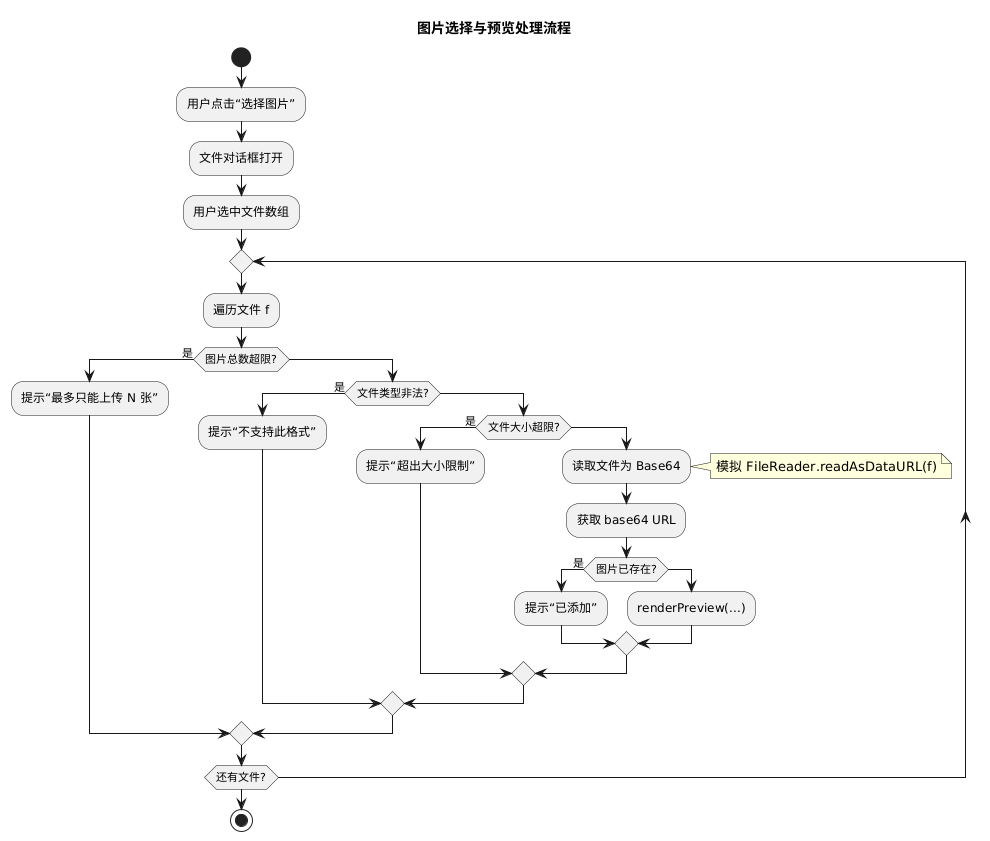 当用户不断新增或删除图片时,images 数组必须与页面上的预览项保持一一对应。这一点虽不复杂,但很容易遗漏:要删除的不仅仅是 DOM 节点,还要把对应的 Base64 URL 从数据里剔除。