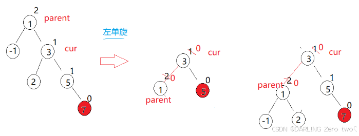 如果原来 curleft 平衡因子为 1 ,即在 curleft 右边新增,那么 cur 和 curleft 平衡因子都为 0,parent 的平衡因子为 1