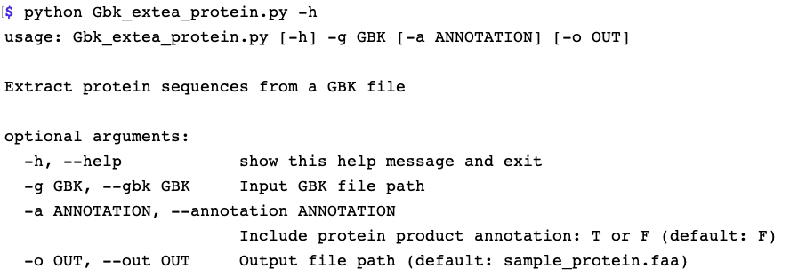 python Gbk_extea_protein.py -g NC_000913.gbk -a F -o NC_000913_protein.faa