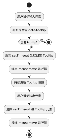 setTimeout 实现了延迟;mousemove 中不断更新 left/top,确保 Tooltip 跟随;mouseout 中清理了计时器和 Tooltip 元素,防止内存泄露。最初我没有加 closest(),结果发现当鼠标移到元素的子节点时,Tooltip 会提前消失,这是个坑,后来改成了 closest('[data-tooltip]') 才解决。