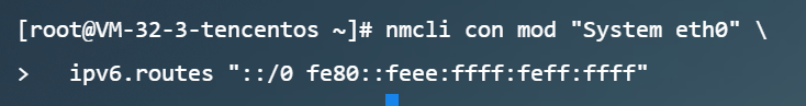 ipv6.routes "::/0 fe80::feee:ffff:feff:ffff"