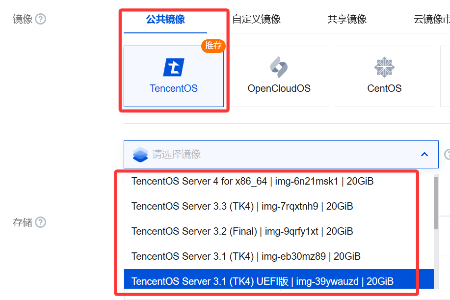 1.购买的CVM服务器,公共镜像要选择为TencentOS Server 3版本或者是4版本如下图所示: