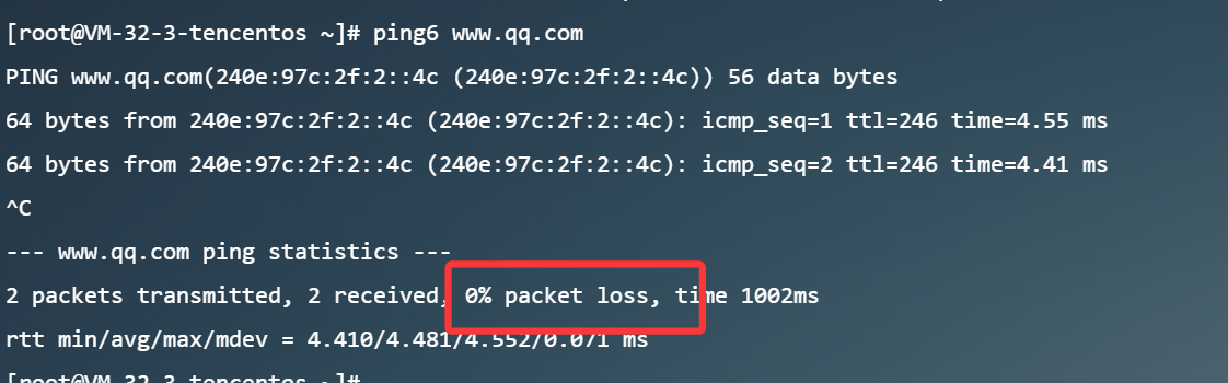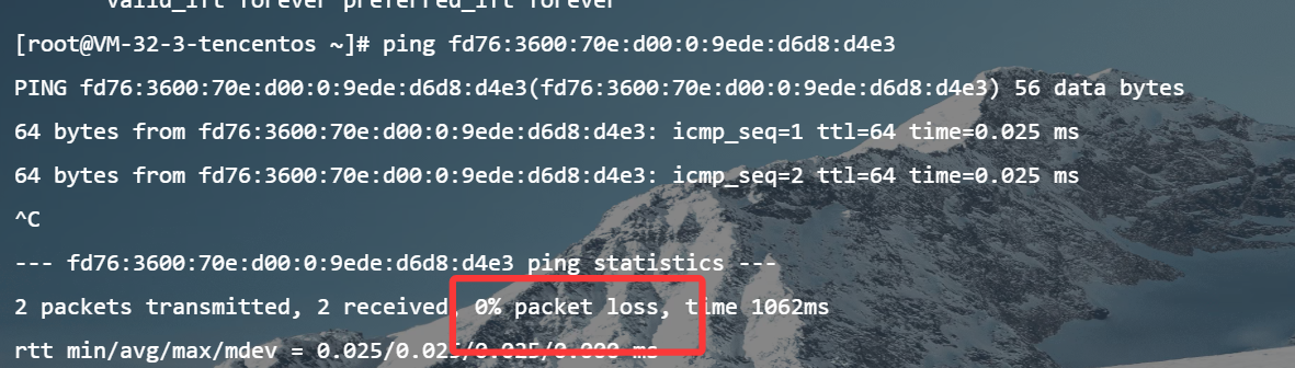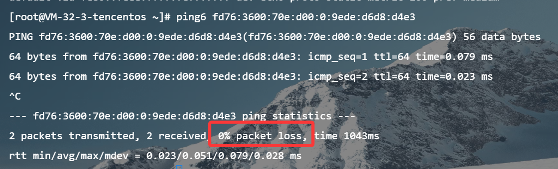 确保系统的防火墙已经放通了IPV6地址,然后PING自己的ULA内网IPV6地址(这里的IPV6地址替换为自己控制台给CVM分配的ULA ipv6地址),看看是否可达