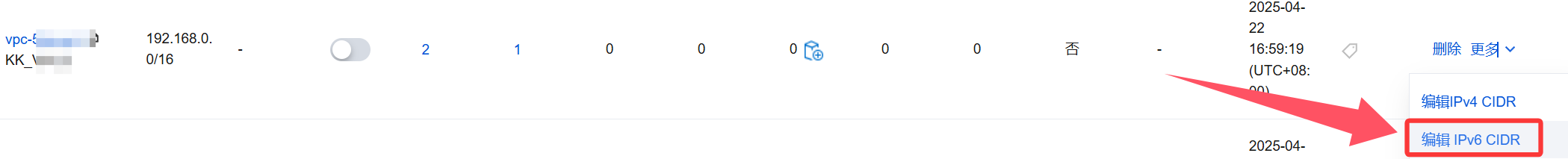 2.找到服务器所在VPC,或者是需要开启IPV6的VPC,点击[更多]-[编辑 IPV6 CIDR]