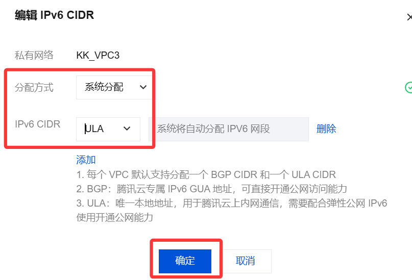 3.分配方式选择:系统分配。IPV6 CIDR选择为ULA,然后点击确认。