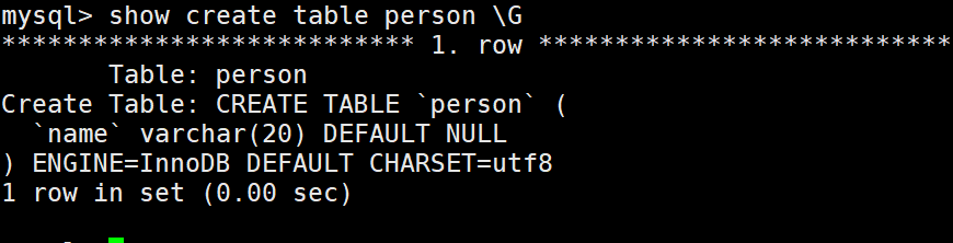 show create table 表的名字 \G; 这里的\G是为了清楚表中没有用是数据,增加可读性。
