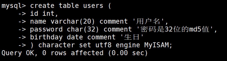 CREATE TABLE table_name ( field1 datatype, field2 datatype, field3 datatype ) character set 字符集 collate 校验规则 engine 存储引擎;