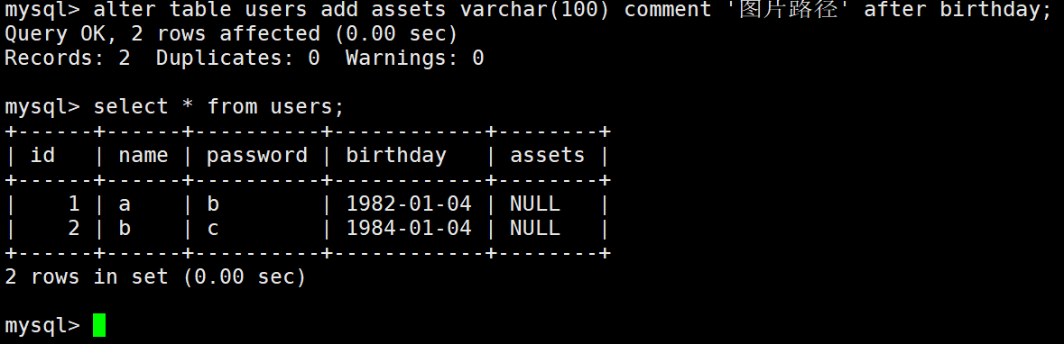 alter table users add assets varchar(100) comment ‘图片路径’ after birthday;