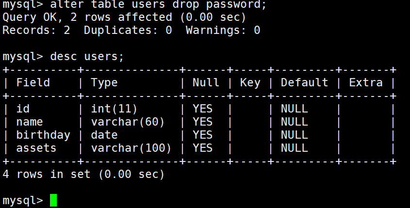 删除password列: 注意:删除字段一定要小心,删除字段及其对应的列数据都没了。