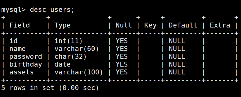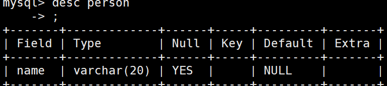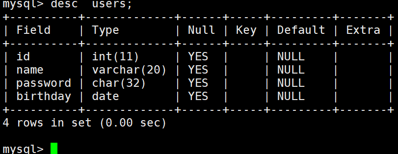 Field:字段名字 Type:字段类型 Null:是否允许为空 Key:索引类型 Default:默认值 Extra:扩充