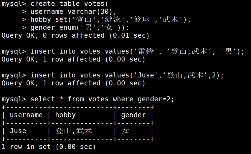 mysql> select * from votes where find_in_set(‘登山’, hobby); ±---------±--------------±-------+ | username | hobby | gender | ±---------±--------------±-------+ | 雷锋 | 登山,武术 | 男 | | Juse | 登山,武术 | 女 | | LiLei | 登山 | 男 | ±---------±--------------±-------+