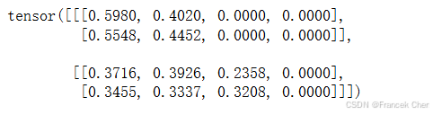 masked_softmax(torch.rand(2, 2, 4), torch.tensor([2, 3]))