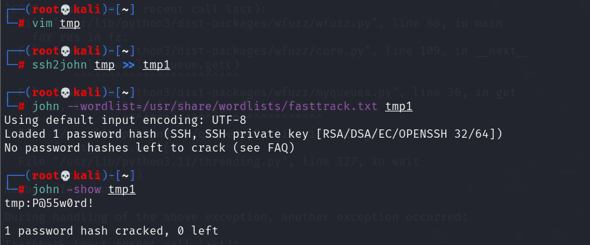 john --wordlist=/usr/share/wordlists/fasttrack.txt tmp1