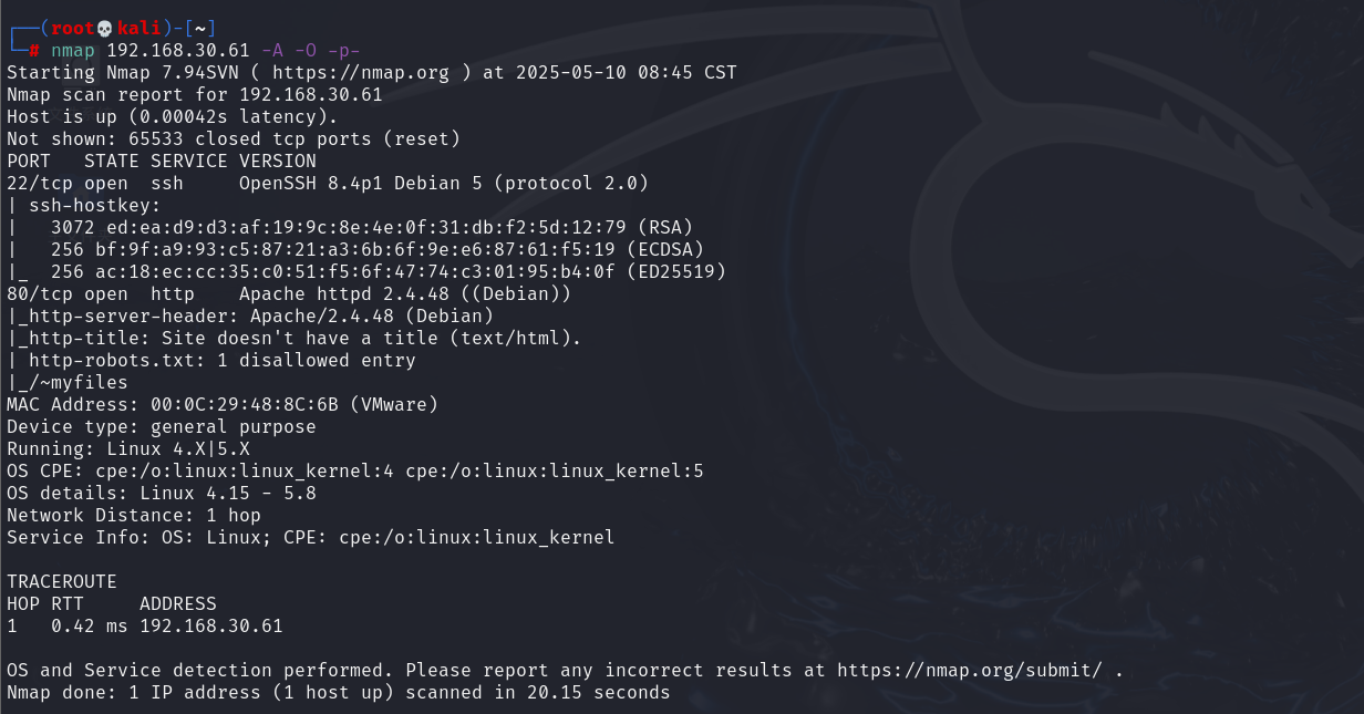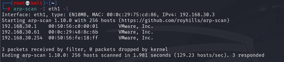 我是用kali的arp-scan,也可以用namp扫网段扫出来。这里可以用很多工具扫出来之举例一种。