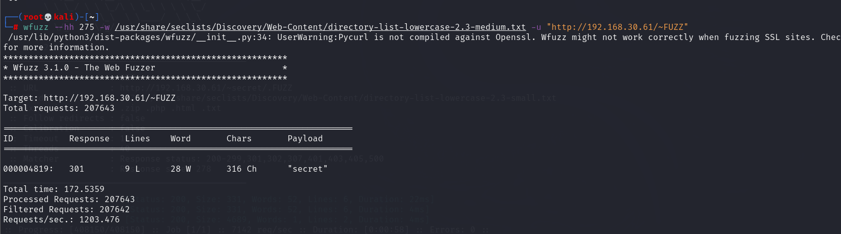 wfuzz --hh 275 -w /usr/share/seclists/Discovery/Web-Content/directory-list-lowercase-2.3-medium.txt -u "http://192.168.30.61/~FUZZ"