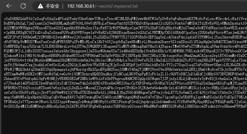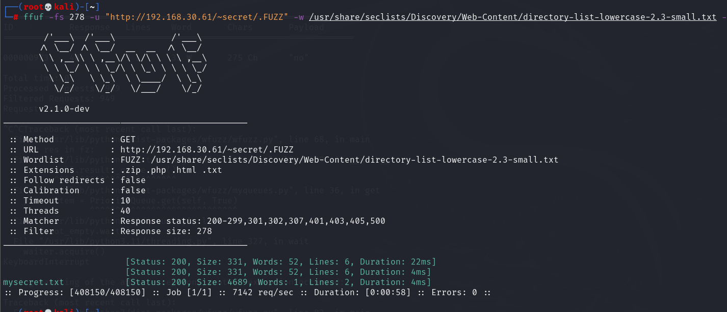 ffuf -fs 278 -u "http://192.168.30.61/~secret/.FUZZ" -w /usr/share/seclists/Discovery/Web-Content/directory-list-lowercase-2.3-small.txt -c -ic -e .zip,.php,.html,.txt