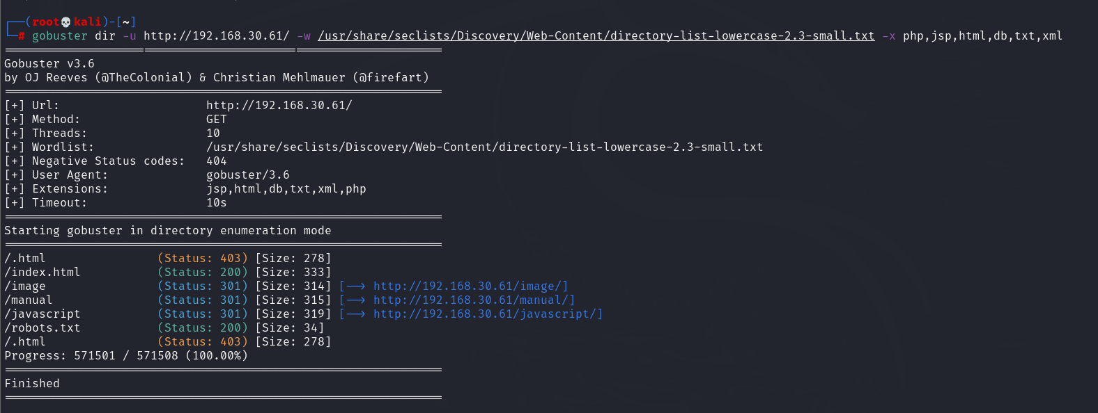 gobuster dir -u http://192.168.30.61/ -w /usr/share/seclists/Discovery/Web-Content/directory-list-lowercase-2.3-small.txt -x php,jsp,html,db,txt,xml