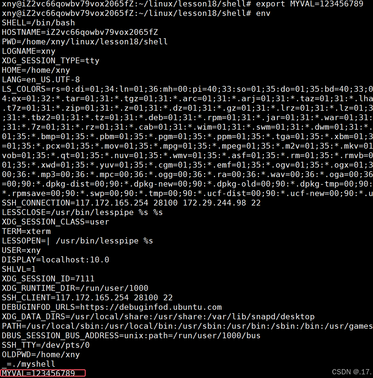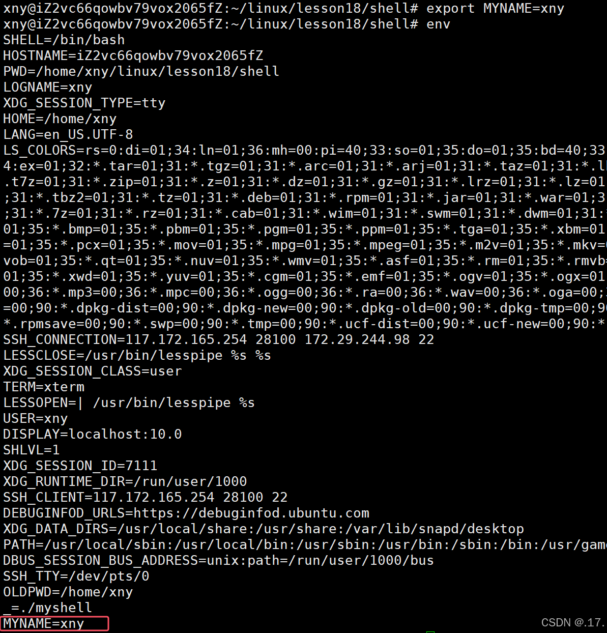 else if (_argc == 2 && strcmp(_argv[0], "export") == 0)export,且参数个数为 2。变量=值 格式字符串存储到全局变量 myenv。putenv 将该变量添加到环境变量中。commandline当中,只要当下一次输入指令,上一次定义的环境变量就会被清空。putenv 添加环境变量,并不是把对应的字符串深拷贝到系统的环境变量表当中,而是把该字符串的地址保存在系统的环境变量表中(浅拷贝)。因此我们要确保保存环境变量字符串的那个地址里的环境变量不会被修改,所以我们需要为用户输入的环境变量,也就是那一串字符串单独开辟一块空间进行存储,保证在内次重新输入指令的时候,不会影响到之前用户添加的环境变量。所以我们需要定义一个二维数组用于存储导出的环境变量(这里只简单地分配了一维数组)。
