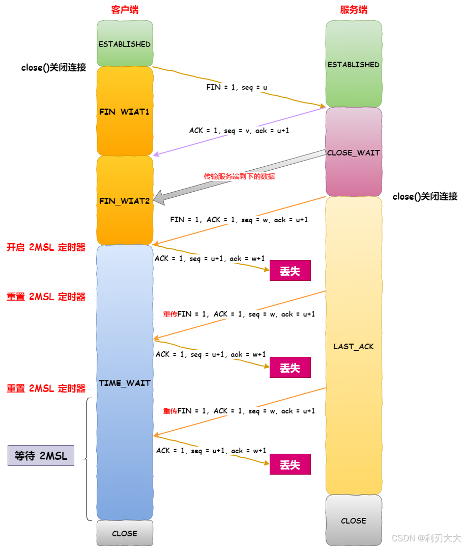 假设此时服务端的序号为 w(因为前面传输剩余数据之后可能序号发送了变化),则服务端会在报文中携带 seq = w 和 ack = u+1(重复发一次),然后服务端就进入了 LAST_ACK 状态等待客户端的确认应答。