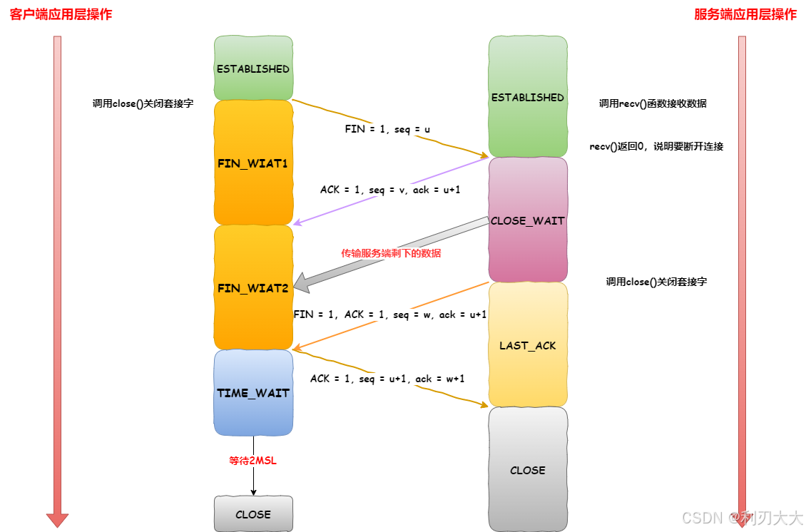 之后客户端收到服务端的确认关闭之后,会进入 FIN_WAIT2 状态;而服务端之所以进入 CLOSE_WAIT 状态,是因为可能此时服务端还有之前没处理完的数据,在这个状态之内会 将这些剩余的数据都发送给客户端,而客户端也依然会接收,相当于客户端之前调用的 close() 只关闭了写端,而这个状态可能会持续一段时间直到数据发完!