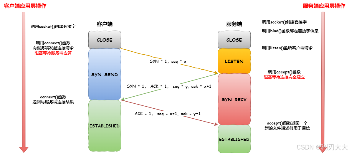 2、因为服务端是为了服务客户端的,所以它会提前调用 listen() 函数进行对客户端请求的监听。