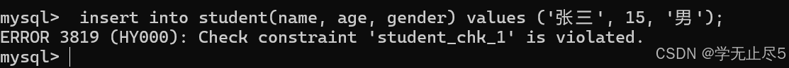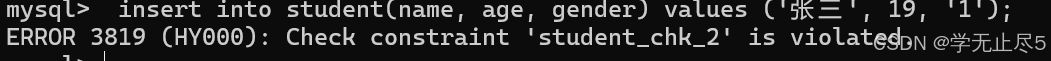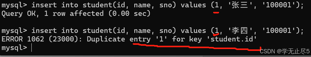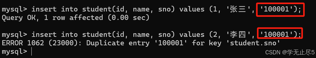 当我们为学号设置列设置唯⼀约束,这时输入相同的学号就会报错