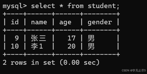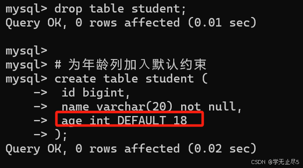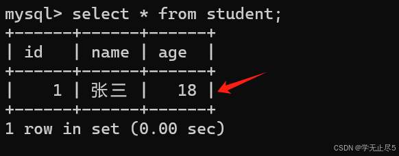 插⼊⼀条记录,不指定年龄的值时列使⽤了默认值,可以看到使用了默认值18