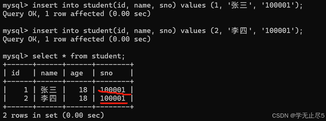 当不设置唯⼀约束时,学号可以重复