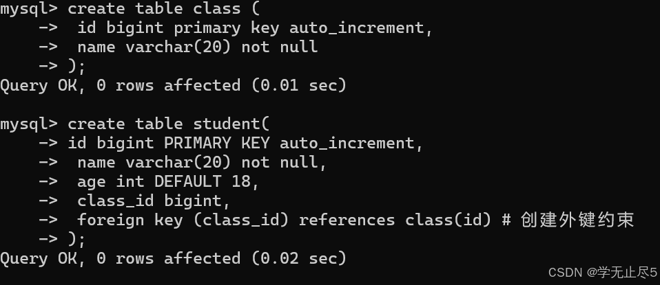 重构学⽣表(从表),加⼊外键约束,在这里创建主表class从表student